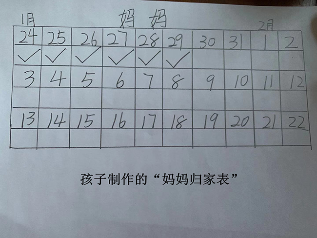 进入隔离病房前,我迅速调整好心态,立即投入工作。刚到病房的第一个岗就是下夜,夜班一出来家人发来了孩子做的“妈妈归期表”。我看到这张表时,内心五味杂陈,思绪万千,一边是疫情,一边是思念妈妈的孩子,我感觉自己做为母亲很不称职,现在能为孩子做的就是保护好自己,每天孩子都要视频对话,问我在干嘛、在哪、吃什么、为什么还没回来、等我可以出去玩的时候妈妈是不是可以提前回来……。
