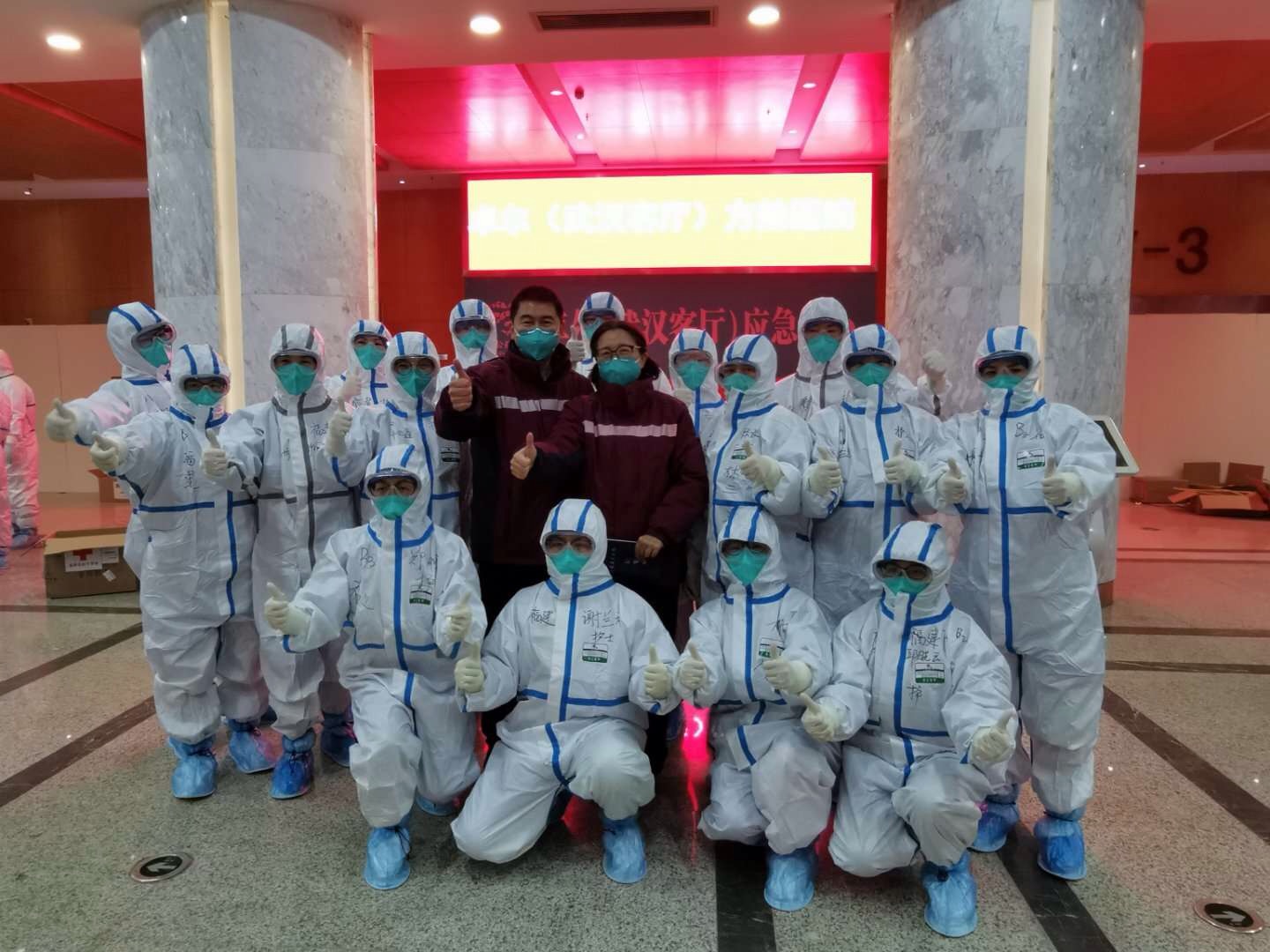 何兰兰与队友们在方舱医院合影