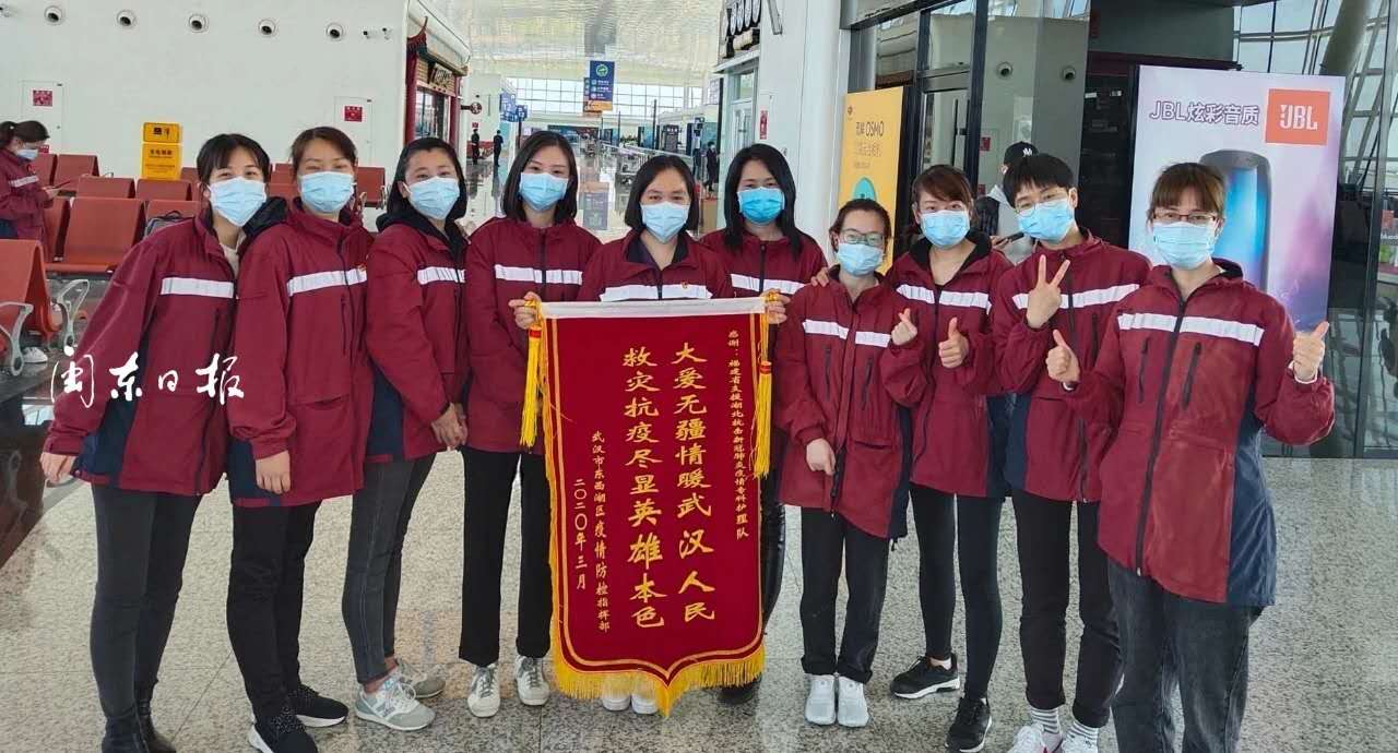 林燕梅(中间拿锦旗者)与宁德市援鄂专科护理队员合影(资料图)