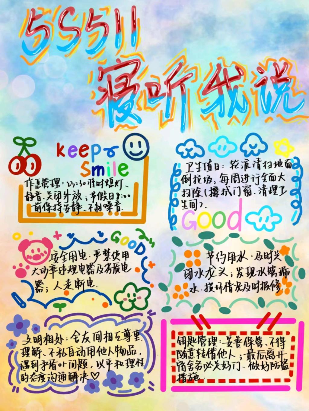 活动中,各宿舍同学积极参与到宿舍公约的设计当中,大家集思广益,设计贴合学生实际生活的宿舍公约,并且对作品版面进行了合理的设计和排版,实用兼并美观,充分展现了平日同学们对宿舍的优秀管理经验和主观能动性。引导学生重视宿舍生活规范,提升自我管理能力,营造良好的宿舍氛围。