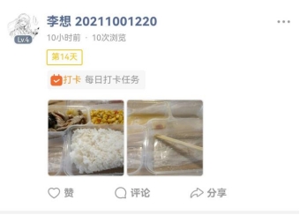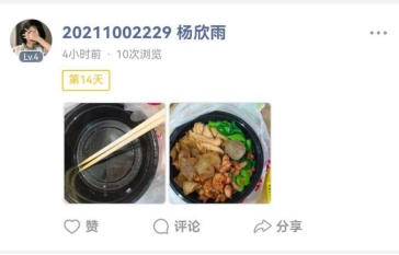 活动开展后,同学们踊跃参与,共有111人参与,在14天活动期间,大家打卡不断,纷纷晒出自己餐前和餐后餐盘的照片,从满满当当到几乎空无一物,体现了同学们对于杜绝浪费的态度,彰显了同学们对于此次活动的热情,将“厉行节约、杜绝浪费”贯彻到日常生活的每一刻。对于此次活动,2021级护三班查宏瑞同学深有感触,“以前在吃饭的时候总会不自觉的剩下一部分饭菜,现在通过这次活动我深刻的认识到了勤俭节约的可贵,在之后的生活中也会注意在勤俭节约这一方面的细节。”