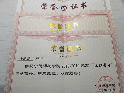 获奖者之一,2018级护理学专业的许琇琇同学,在校期间认真学习专业知识,努力规范自身护理操作技术,曾获得“校优秀学生一等奖学金”、“国家奖学金提名奖”、“省运会优秀志愿者”、“英国上市公司365菲华-鸿志奖学金”、“宁德市直机关优秀共青团员”、“校三好学生”等荣誉。
