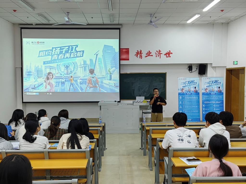 为促进2025届毕业生更早更高质量就业,10月25日下午,我院举办企业进校园专场宣讲会,邀请扬子江药业集团来我院招纳人才。我院药学专业学生90多人参加宣讲会。