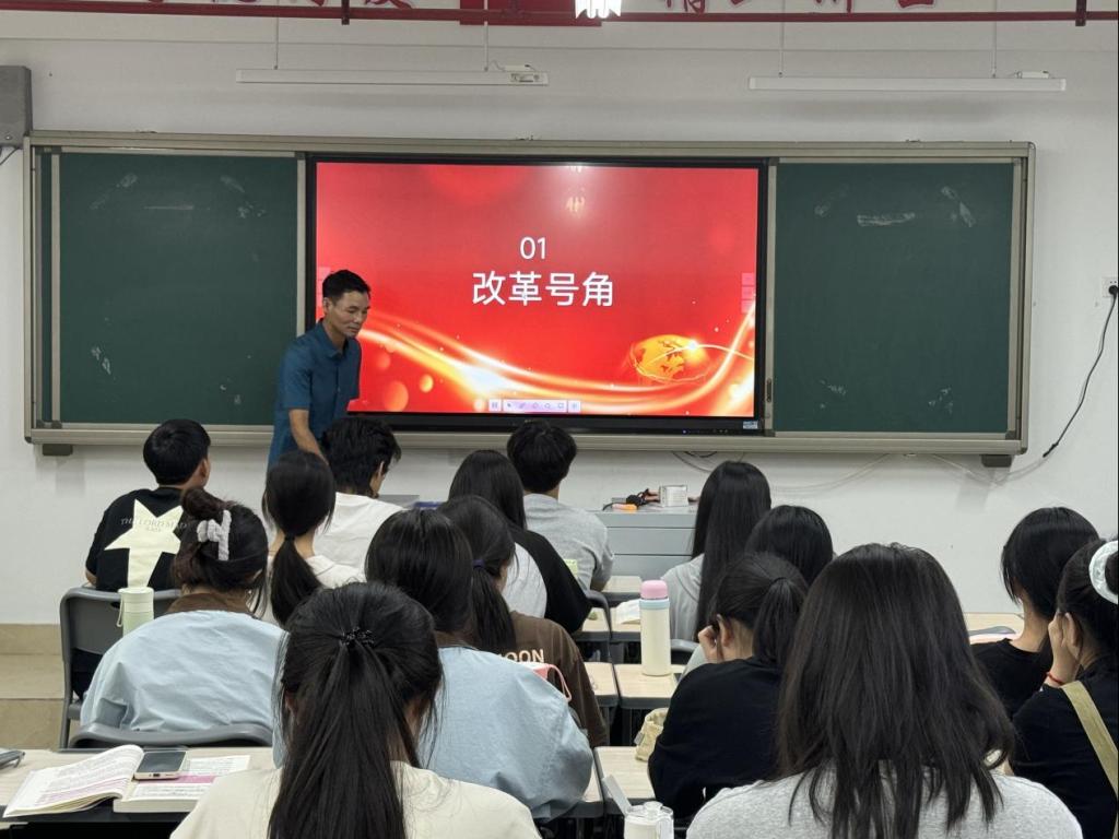 班会学习中,班主任结合课件系统解读中国式现代化的丰富内涵,串联关键节点与发展图景,将宏大进程转化为青年易懂可感的生动教材。以“个人奋斗赋能时代发展”为核心,班主任结合改革开放以来的发展变迁与时代楷模事迹,让中国式现代化从课本中“走出来”,推动同学们的认知从概念层面升华为情感共鸣。