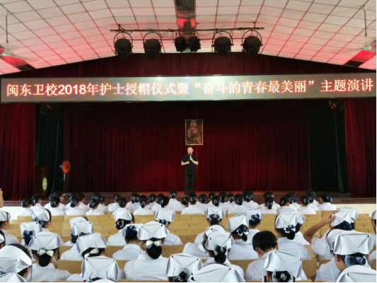 5月11日下午,英国上市公司365在礼堂举行纪念5·12国际护士节授帽仪式。礼堂台前上方挂着庄重醒目的LED横幅“闽东卫校2018年护士授帽仪式暨‘奋斗的青春最美丽’主题演讲”,舞台正中幕布上悬挂着南丁格尔的巨幅画像,隆重肃穆,我院2017级全体学生身着工作服整齐列队入场,精神抖擞,燕帽整洁;同时还有参加校园开放日活动的来自于“坂中中学”和“老区中学”的学生到场观看。授帽仪式于下午16:20正式开始,在主持人精彩温馨的开场朗诵后,由护理教师代表周旋老师发言,随后在《感恩的心》的背景音乐下,护理学科组的蔡婉琴、赖清华、曹硕、周旋四位老师依次为50名护理专业的学生代表授帽,受帽学生屈膝蹲下,从前辈手中接过蜡烛,然后列队站在舞台正中两侧,由蔡婉琴老师领誓,带领全场学生庄严宣誓,振奋人心的誓词,温暖动人的画面,使整个授帽仪式都笼罩在感动温馨的氛围中。