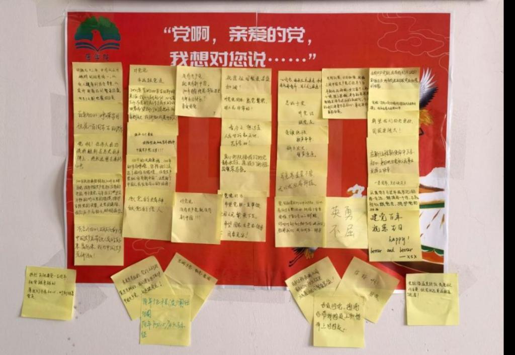 党史学习教育开展以来,我院通过党史学习教育宣讲、组织学生观看党史纪录片、举办党史专题学习会议等形式,全体同学一起学习和了解党的百年发展历程,最后写下内心祝福。深情祝福奏响红色旋律,感恩奋进谱写时代华章。祝福语虽简短,却充分表达了青年学子对党的深厚情感和真挚祝福。