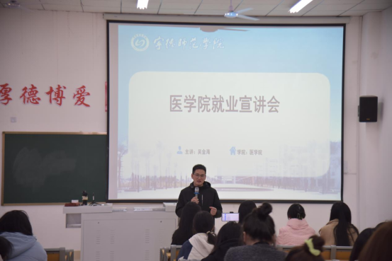 会上,吴金海老师分析了医学类毕业生当前的就业形势,介绍了往届毕业生的就业情况和招聘岗位需求等方面的内容,希望同学们树立先就业后择业的观念;通过讲解求职技巧,帮助同学们深入了解企业招聘要求,同时会上对就业前的准备工作和就业信息获取进行了全面的指导。
