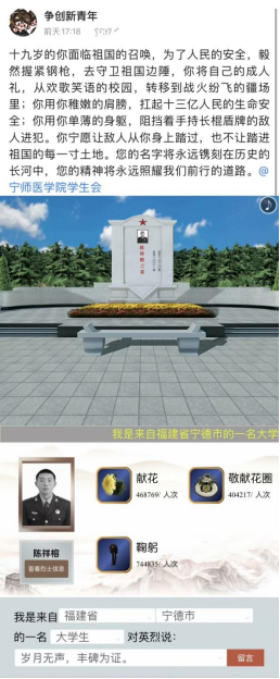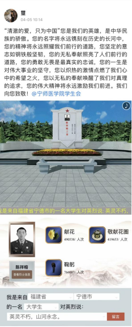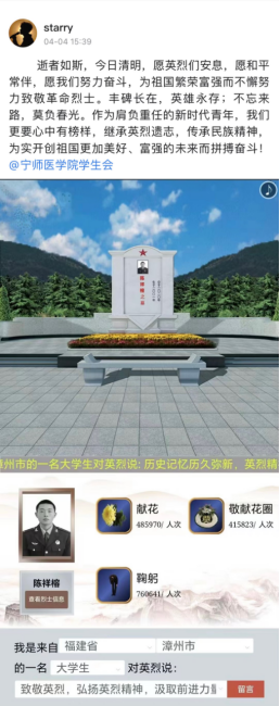 活动得到同学们的积极响应,大家通过网上祭奠、献花、留言等方式,缅怀英雄事迹,传递英雄精神。2022级护理四班的李舒与同学感概留言:“岁月无声,丰碑为证。您的名字将永远镌刻在历史的长河中,您的精神将永远照亮我们前进的道路。”