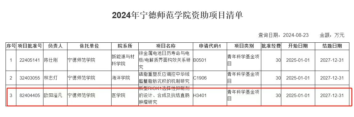近日,2024年度国家自然科学基金申请项目评审结果公布,我院欧阳溢凡博士主持申报的项目《新型RIOK1选择性抑制剂的设计、合成及抗结直肠肿瘤研究》,获得国家自然科学基金青年科学基金项目资助立项,项目批准82404405 ,资助经费30万元。