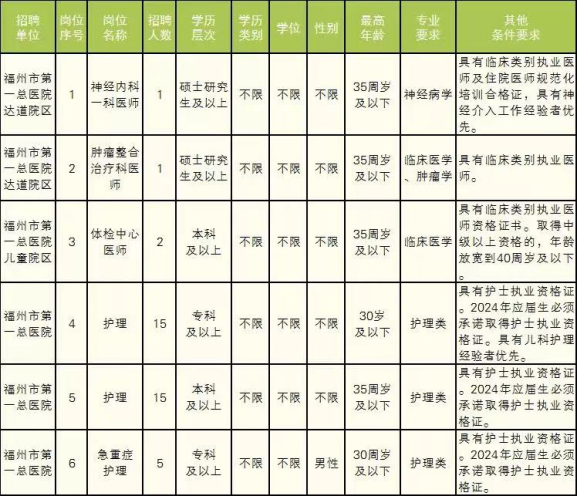 三、报名方式本次考试报名采取线下现场报名的方式进行,不收取报名费。报名方式:请报名者本人携带个人简历、本人身份证、毕业证原件及复印件一份,及岗位条件要求的其他证件原件,复印件到现场报名。报名时间:2024年4月25日-2024年5月7日,请在工作日、工作时段报名(5月1日~3日照常受理),逾期不予受理。报名地点:福州市五一南路52号福州市第一总医院体检中心七楼组织人事部。