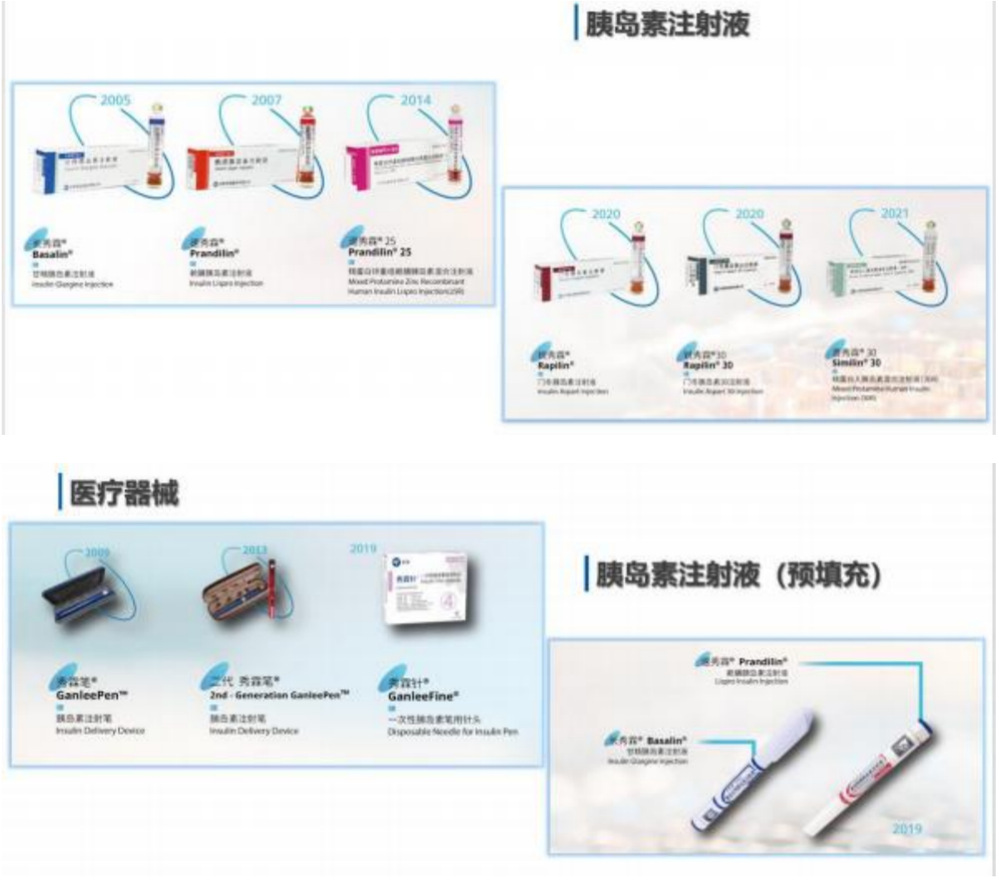 自1998年成立以来,甘李药业使中国成为全世界第三个能够自主生产和销售基因工程胰 岛素的国家。公司成功自研了多款中国首个三代胰岛素类似物,产品全面覆盖长效、速效、预混三个胰岛素功能细分市场以及相关医疗器械领域。