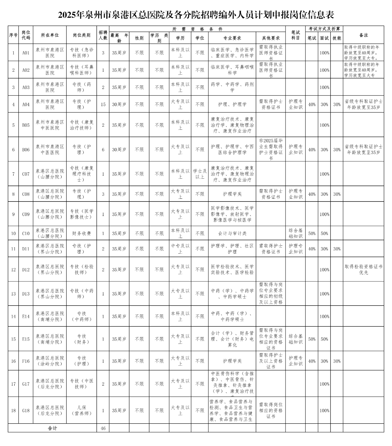 因工作需要,泉州市泉港区总医院及各分院拟招聘编外工作人员46名,具体公告如下: