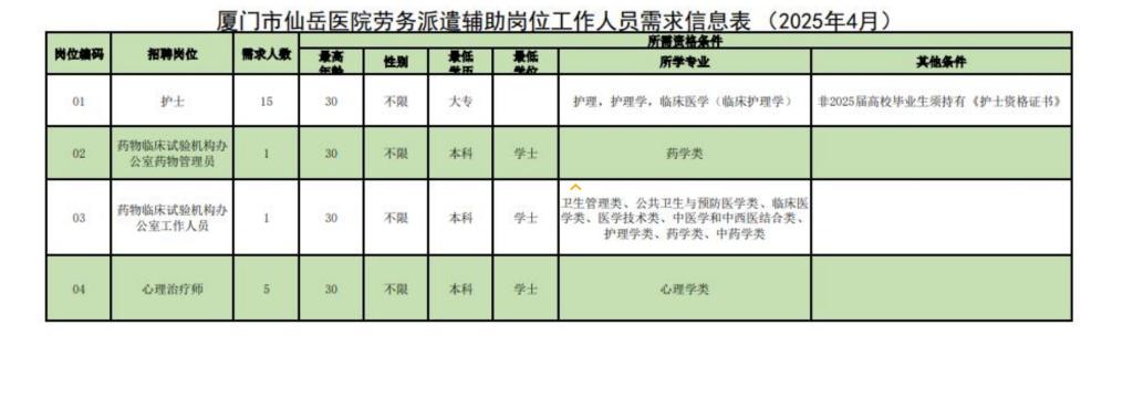 因业务发展需要,厦门市仙岳医院拟向社会公开招聘劳务派遣辅助岗位工作人员22名,现将招聘公告公布如下:
