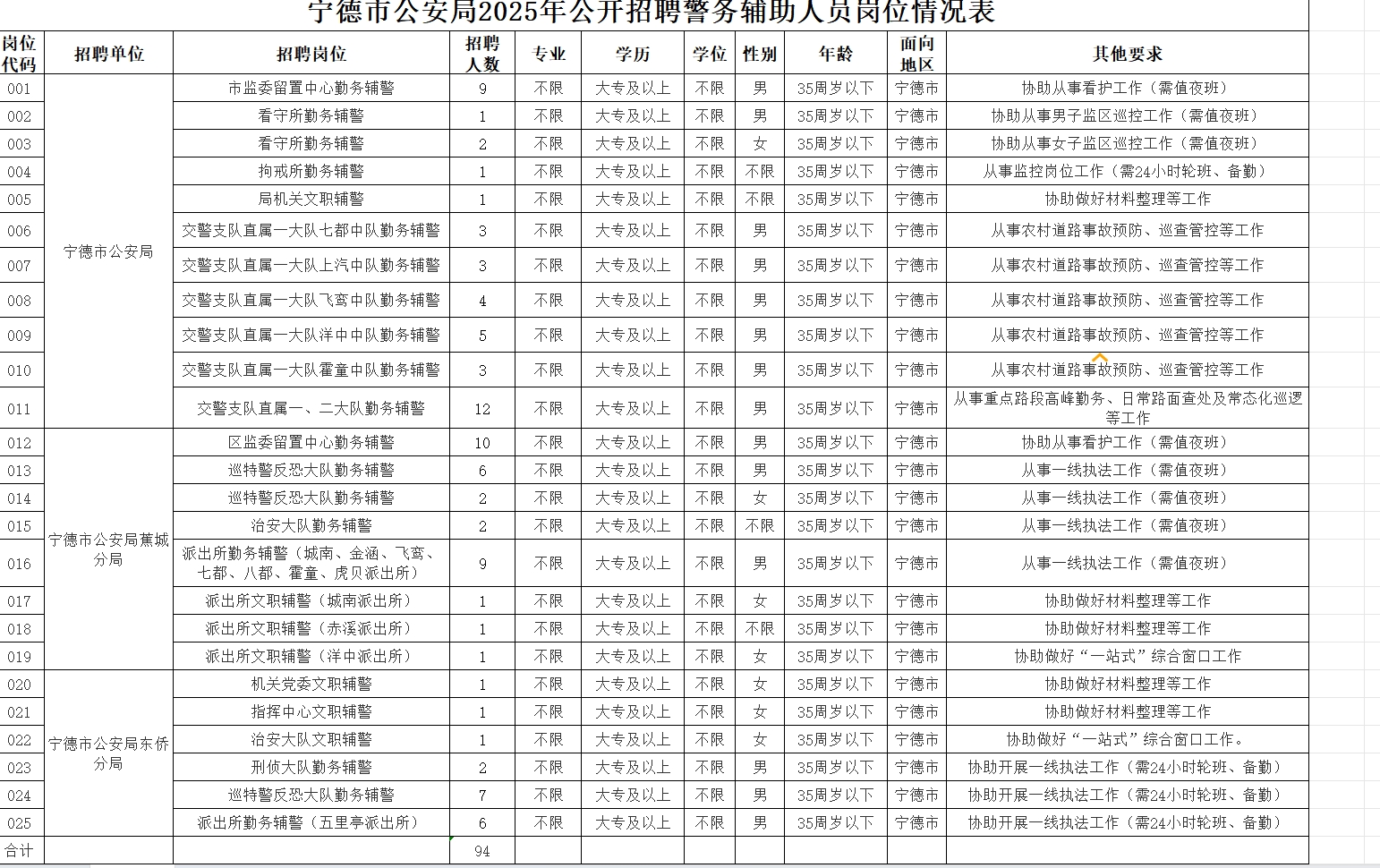宁德市公安局将面向社会公开招聘警务辅助人员(以下简称辅警)。现将有关事项公告如下: