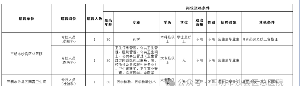 1.年龄要求18周岁以上、30周岁以下(在1995年5月至2007年5月期间出生);2. 具有良好的职业道德,遵纪守法,无经济、刑事等不良记录;3. 具备岗位所需的学历、专业、年龄及岗位要求的其他条件;4. 本区乡镇卫生院(社区卫生服务中心)现有在岗员工服务期需已满五年。