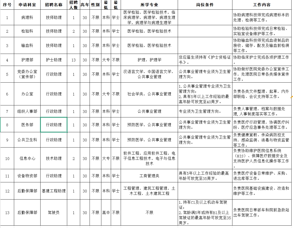 招聘人数、岗位及条件详见《厦门市杏林医院2025年第二季度辅助招聘岗位信息汇总表》(附件1)。
